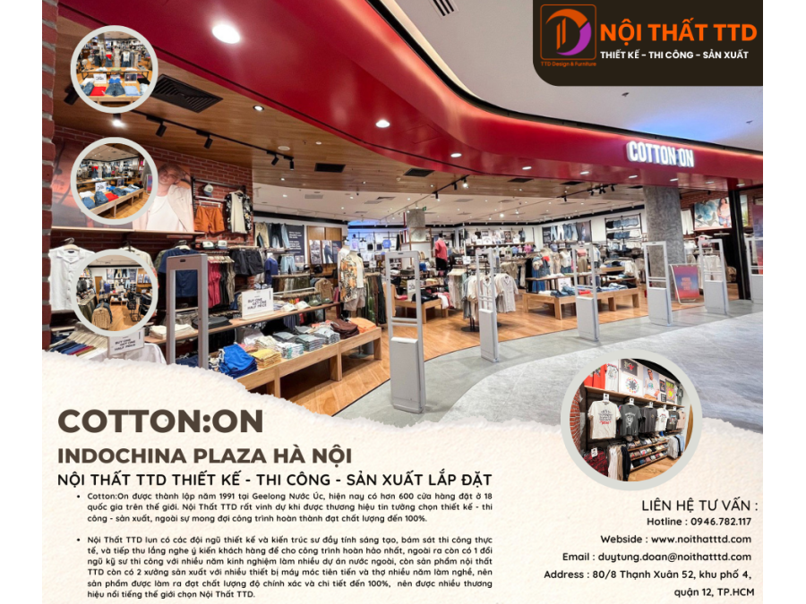 Cotton:On được thành lập năm 1991 tại Geelong Nước Úc, hiện nay có hơn 600 cửa hàng đặt ở 18 quốc gia trên thế giới. Nội Thất TTD rất vinh dự khi được thương hiệu tin tưởng chọn thiết kế - thi công - sản xuất, ngoài sự mong đợi công trình hoàn thành đạt chất lượng đến 100%.
